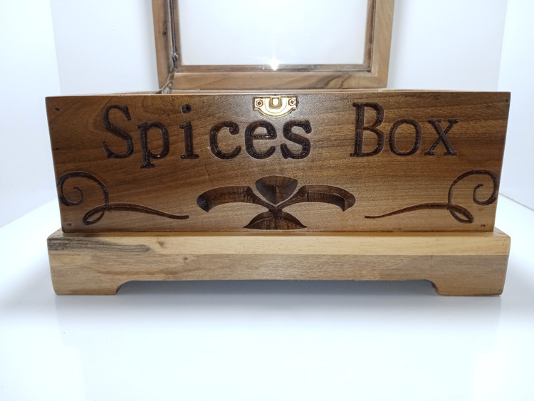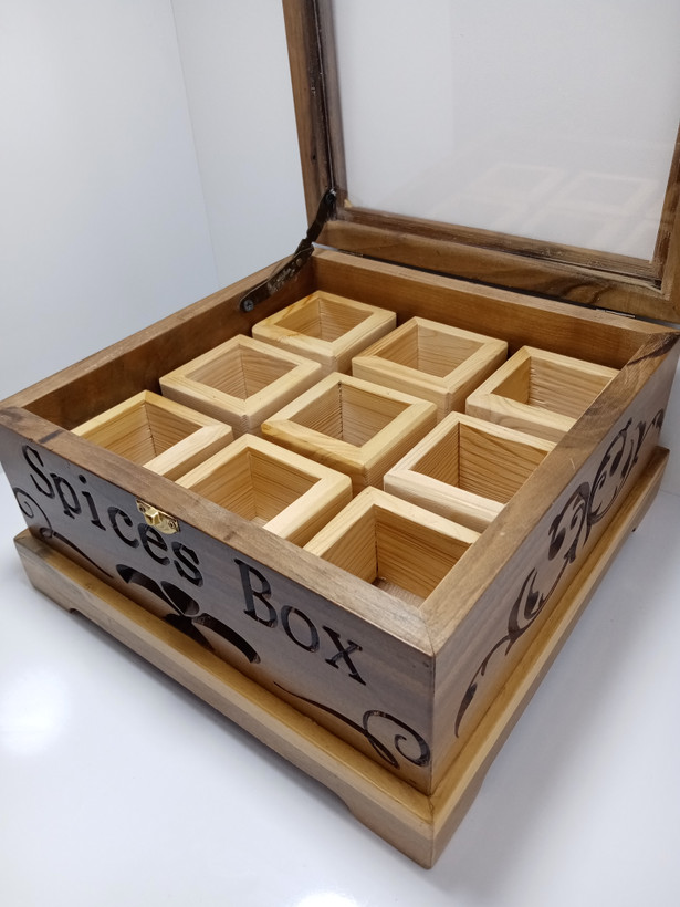 چوب گردو. 4 طرف حکاکی شده. ضخامت بدنه 18 میلیمتر. 9 عدد باکس چوبی از چوب روسی مخصوص ادویه جات.