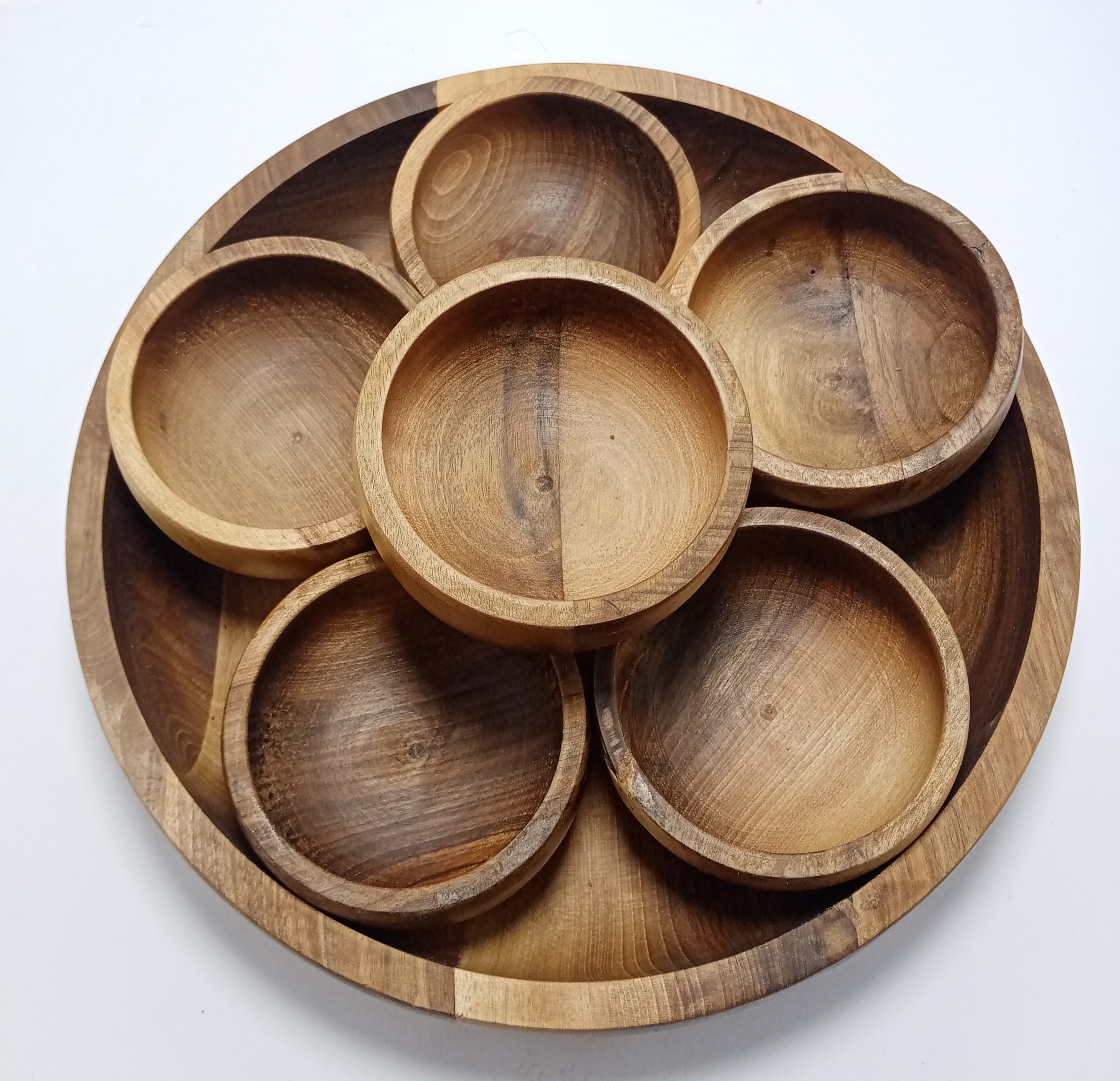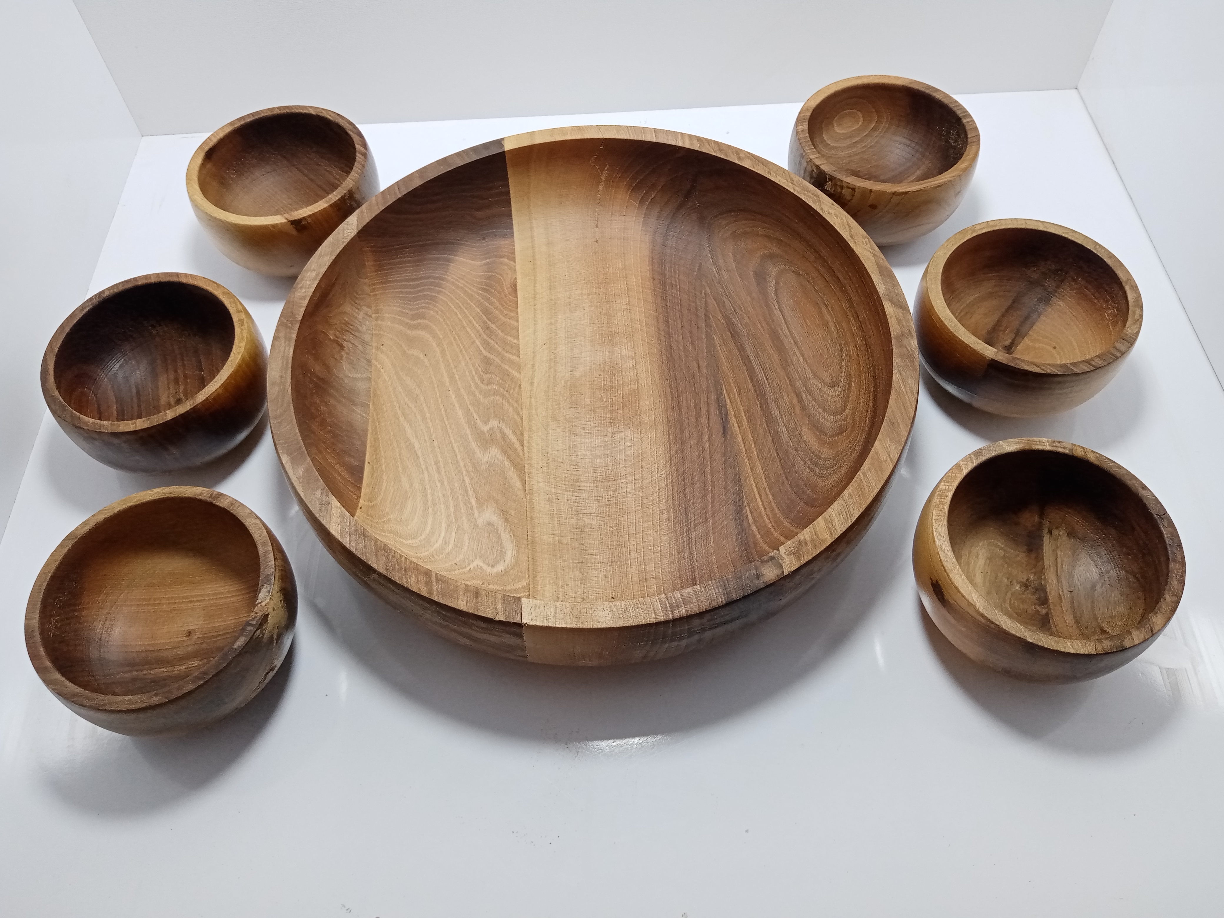 کاسه به قطر 30 سانت و 6 پیاله به قطر 10 سانت و ارتفاع 6 سانت از جنس چوب گردو بسیار شیک و محکم می باشد.